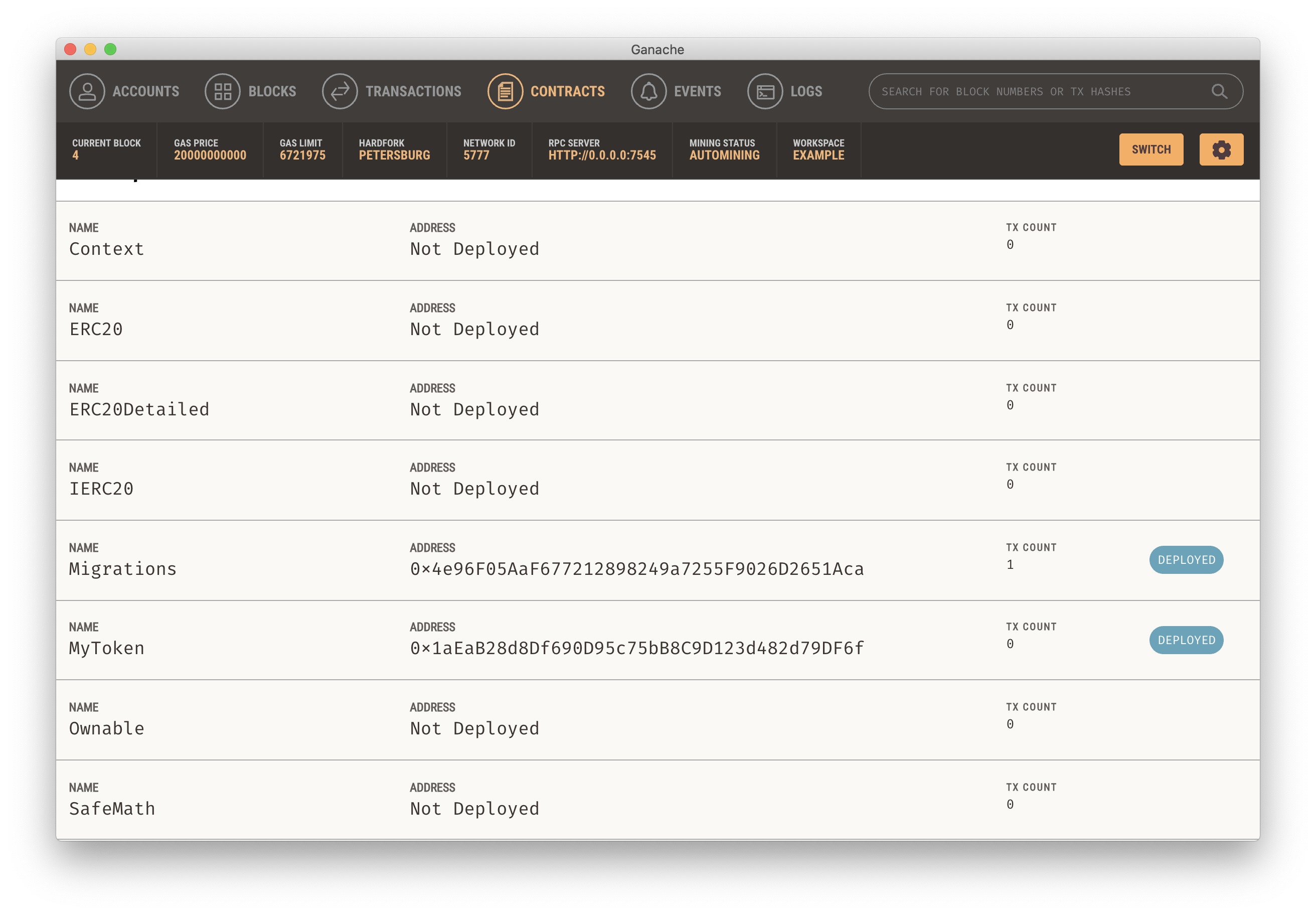 위에 Contracts 탭을 눌러보자. MyToken이 제대로 Deployed 된 것을 볼 수 있다.