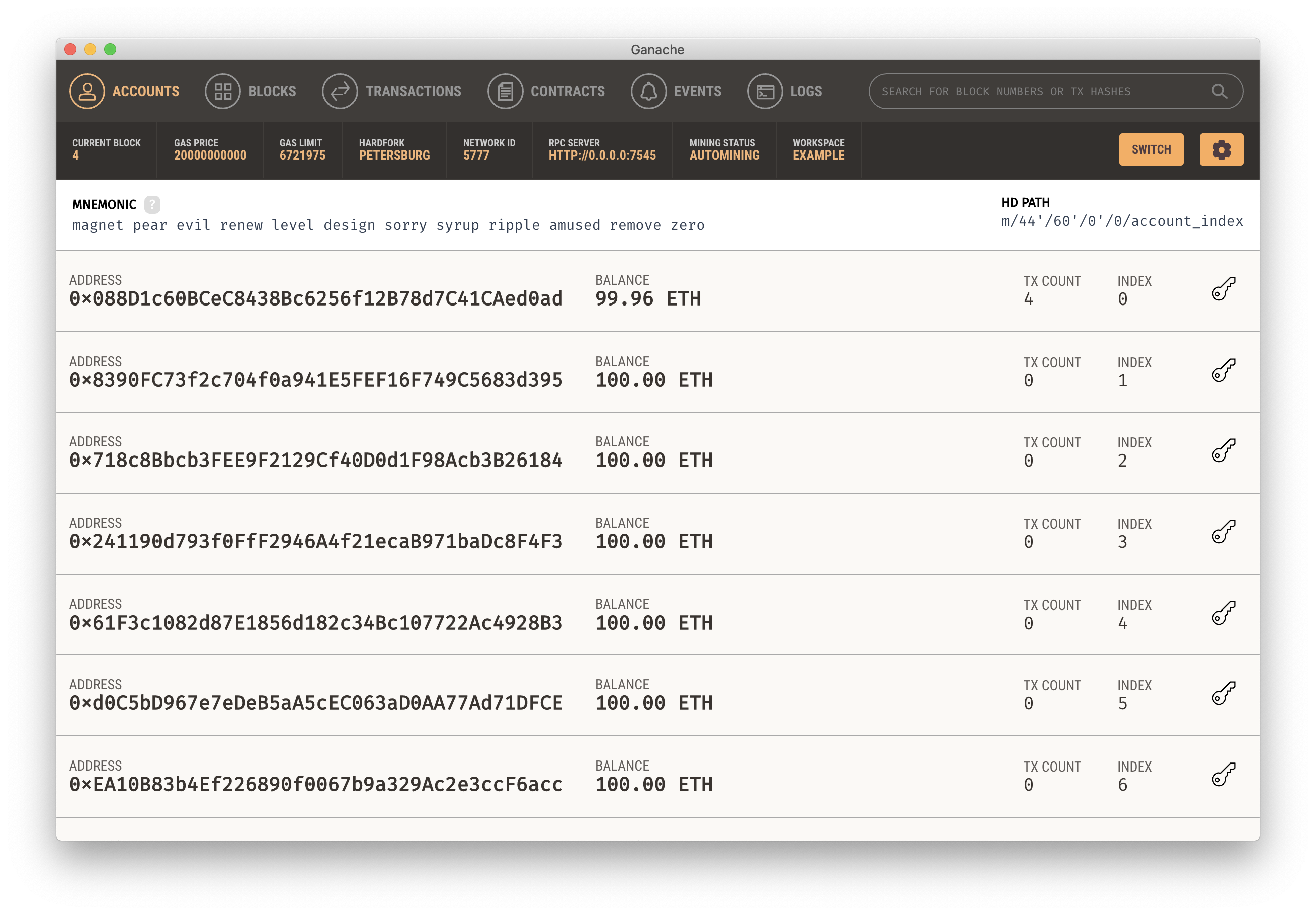 처음 시작을 하면 약 10개의 지갑(사용자)가 생성이 되고 일단 100 ETH가 지급된다. 이 ETH는 1편에서도 말씀드렸듯이, Smart Contract 배포 및 이용을 위한 수수료 지불에 사용된다.