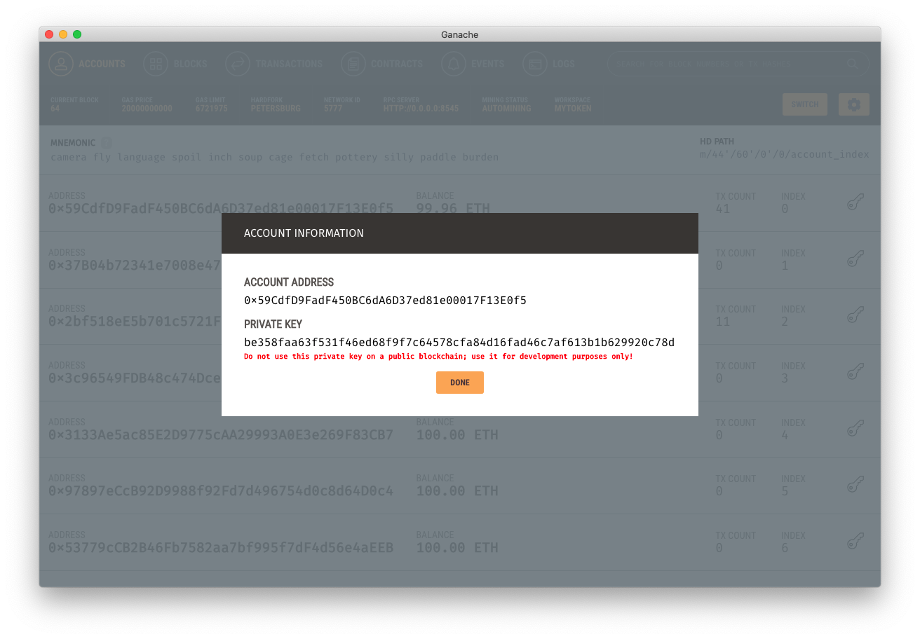 Token발행을 위해서는 해당 SmartContract를 Deploy(배포)한 사람만이 발행할 수 있기 때문에 우리는 Deployer의 Credential을 가져올 것이다. Deploy가 누구냐면.. 이전 편에서 보았듯이, Ganache에서는 0번째 index의 Account가 Deployer다. 발행 후 로그에 뜬 그 account다. 우리는 이 사람의 Credential을 이용하여, 특정 Account(주소)로 Token을 발행해 볼 것이다.