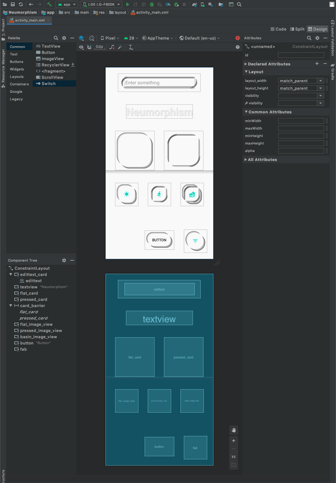 레이아웃의 구성을 XML코드로 작성 시 Component Tree에 레이아웃 구성요소가 자세하게 나와있습니다. Preview를 통해서도 실행 시 어떻게 보여지는지에 대하여 미리보기를 제공하고 있습니다. XML로 구성을 했기 때문에 만약 실행 시 위젯이 보이지 않더라도 Component Tree에서 해당 위젯을 찾고 XML에서 수정할 수 있죠.