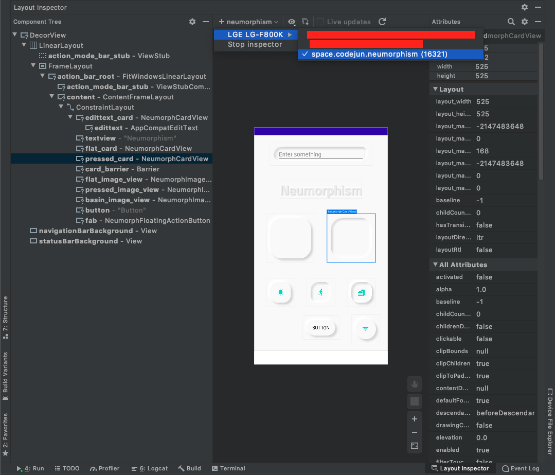 위 사진처럼 디버깅 중인 프로세스를 선택하면 현재 보고 있는 View에 대한 캡처가 진행되고 정보를 보여줍니다. XML로 구성한 위젯들은 물론이고 런타임을 통해 구성된 위젯들과 View 모두 XML에서 구성한 것 처럼 Component Tree에서 확인할 수 있습니다. 각 위젯들을 클릭하면 해당 위젯들의 속성(Attributes)을 확인할 수 있습니다.